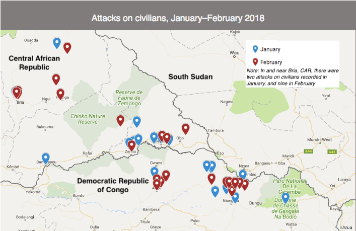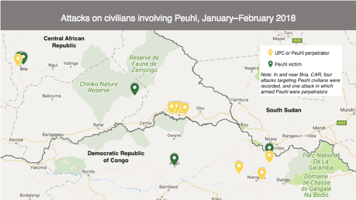 There were at least 22 attacks on civilians in the Mbomou Uele border region in January 2018, in which at least five civilians were killed and 26 others abducted. In February, there were 30 attacks, killing at least 15 civilians and abducting 25 others. One of the most significant changes in January–February 2018 relative to comparable periods in previous years was the dramatic reduction in LRA activity, particularly abductions. There was also an increase in violent incidents involving the Peuhl minority, including seven attacks targeting PeuhI civilians and eight attacks in which armed Peuhl or the majority-Peuhl ex-Seleka faction, the Union pour la Paix en Centrafrique (UPC), were responsible.